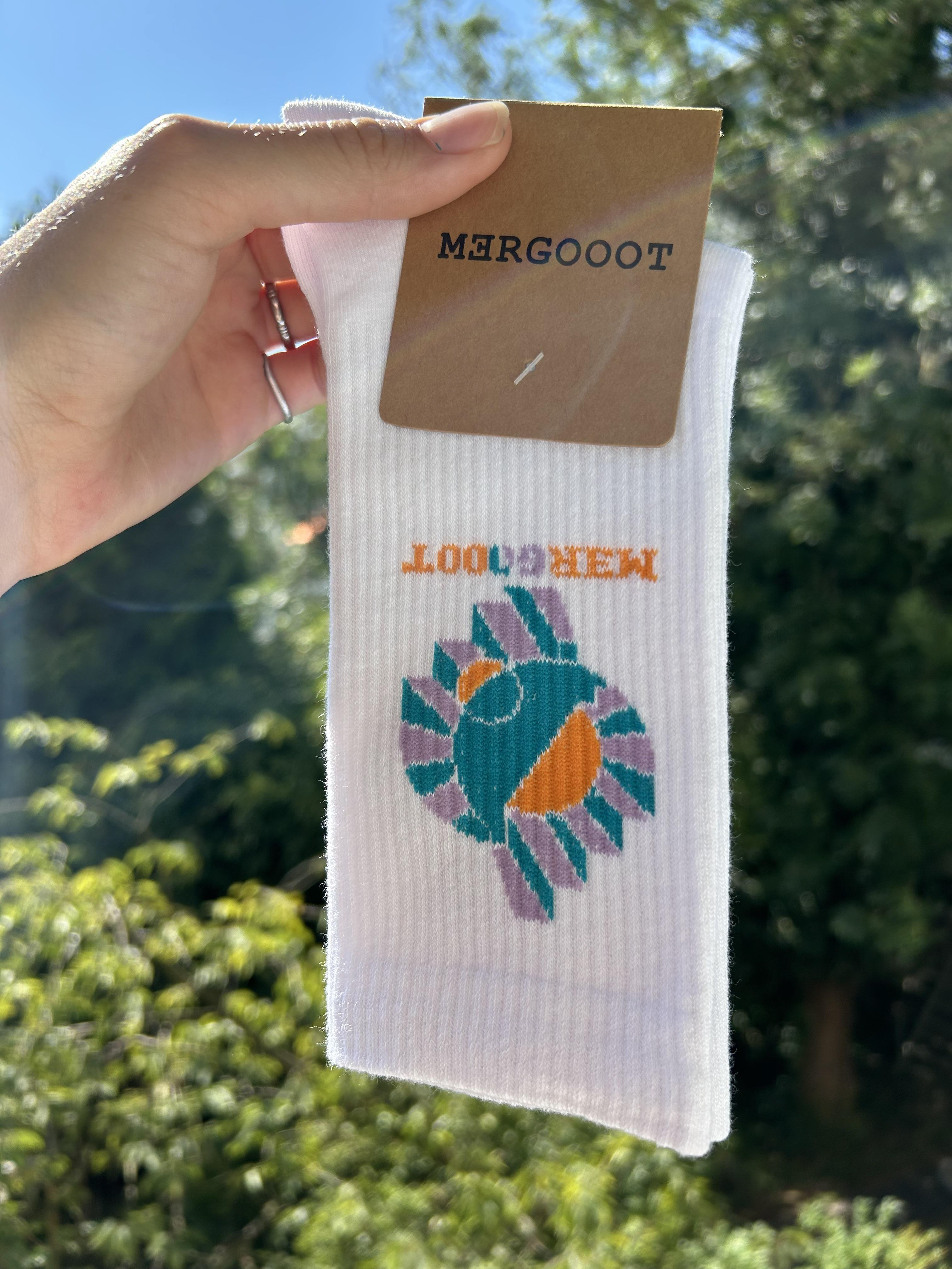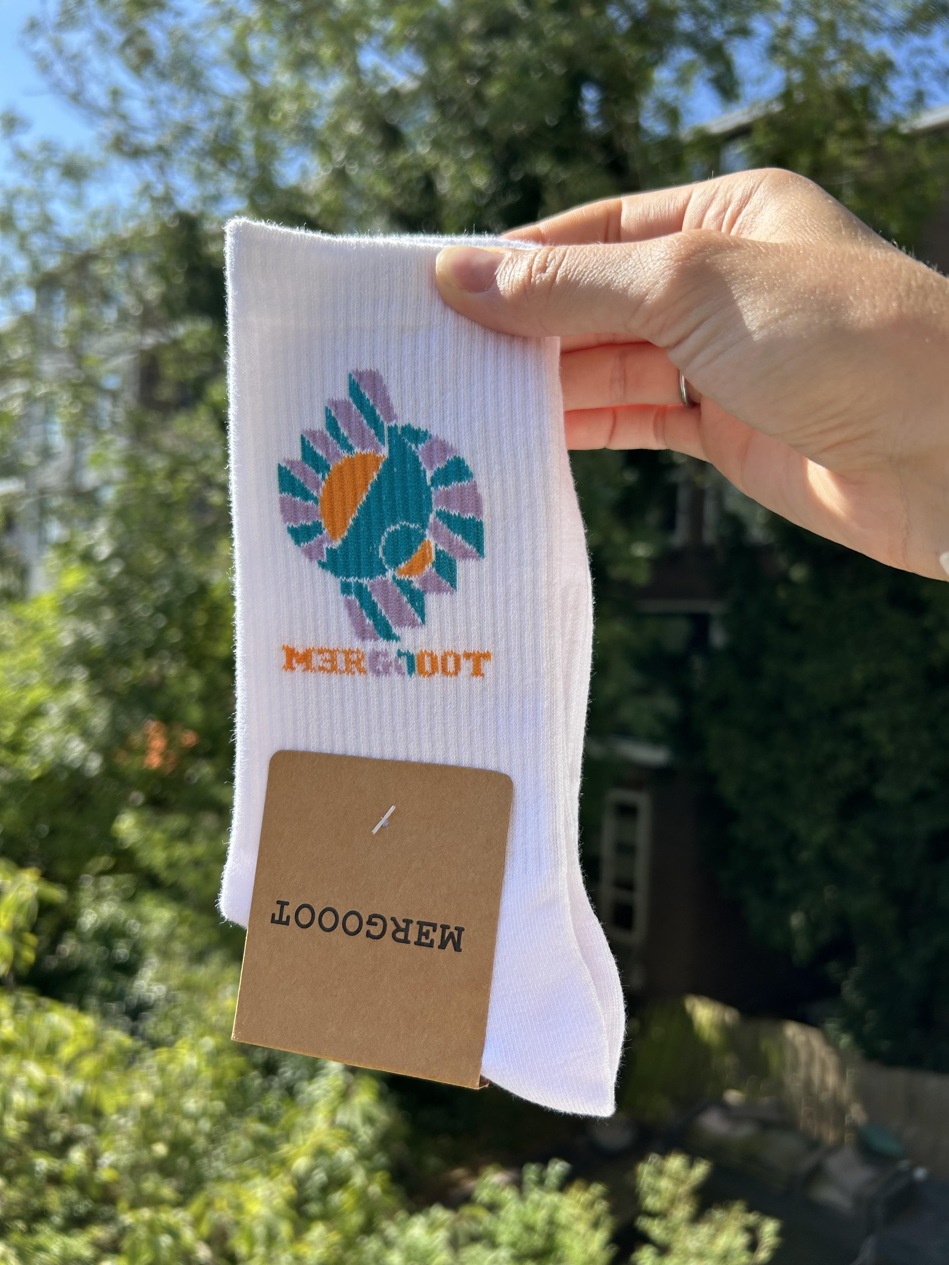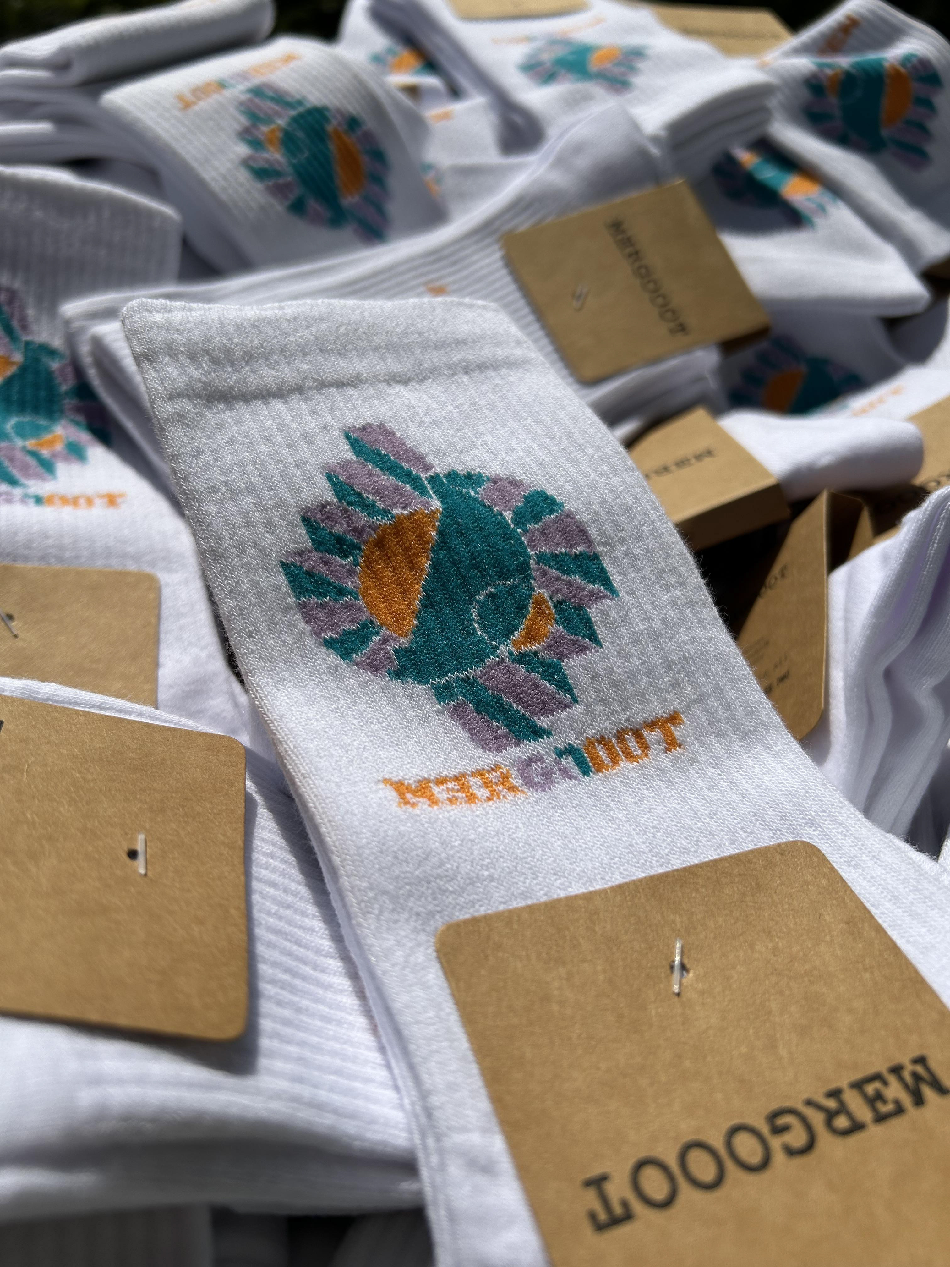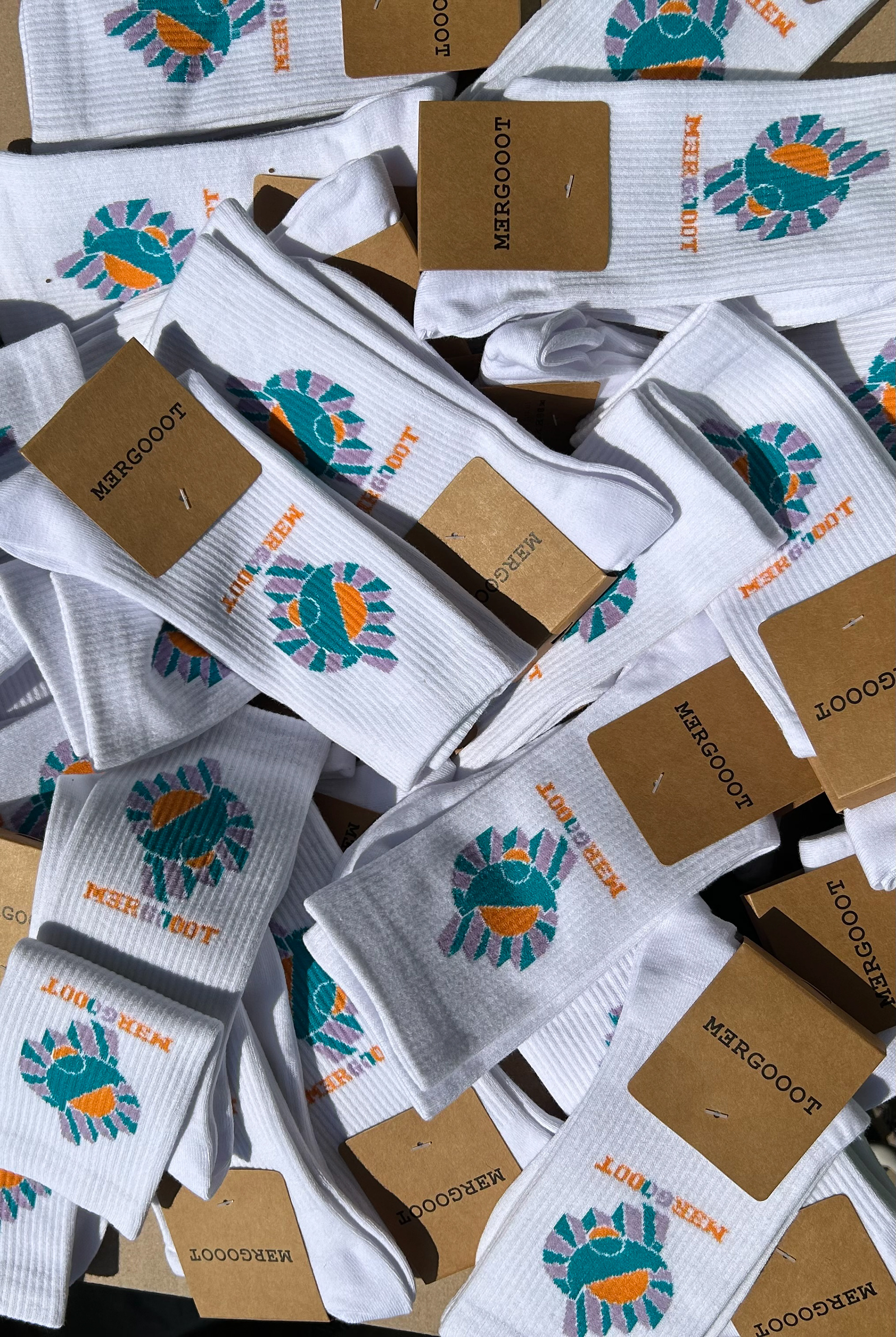 Met mijn bedrijf mergooot, opgericht in 2021, heb ik sokken (2024), T-shirts (2022) en truien (2019) gemaakt. De sokken en T-shirts zijn nog beschikbaar, stuur me een bericht via “Contact” bij interesse. Foto’s: Vincent Beekelaar.